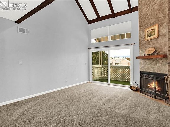 Beautifully UPDATED second floor, three bed, two bath condo with incredible Pikes Peak views from the 13x17 rooftop patio! Laundry inside the unit! The complex backs to Palmer Park, easy access to hiking trails and the HOA covers ALL utilities!. Updates include newer kitchen cabinets, solid surface counters, tile backsplash, stainless appliances, gas range, interior paint, vinyl windows and washer and dryer inside the unit. Both bathrooms have been updated with custom tile tub surround and tile floors. Large main level living room with soaring ceilings, wood beams, wood burning fireplace, custom floor to ceiling stack stone and wood mantel. All bedrooms are on the same level, large master with it's own attached bath. Upper level loft/office or media room.