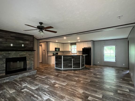 The house features a spacious living room with a lovely fireplace, an open-plan island kitchen, and a spacious dining room. For your convenience, a large capacity washer and dryer are also provided.