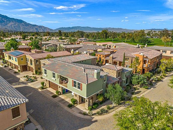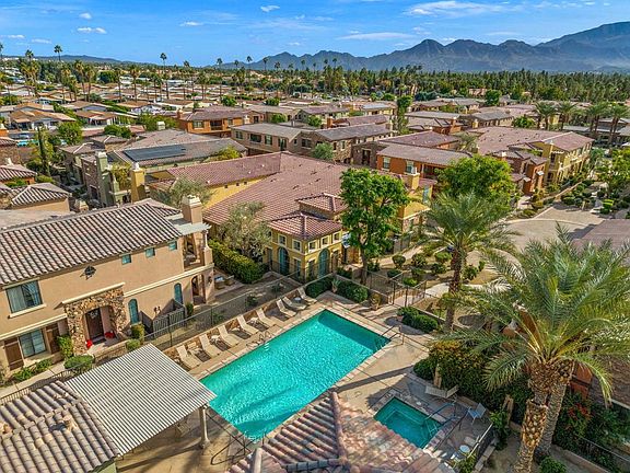 Experience the epitome of sophistication with this elegant single-story end unit. This stunning 2-bedroom + den, 2-bath condo offers a luxurious full-time residence or an ideal part-time retreat. Step into the foyer adorned with soaring ceilings and a grand chandelier. To your right, bask in the character-filled living room flooded with natural light streaming through oversized round windows. Slide open the door to reveal a sprawling private patio enveloped in lush landscaping--a perfect oasis. The open floor plan seamlessly connects the chef's kitchen, custom cabinetry, granite countertops, and stainless steel appliances, to a spacious dining area--perfect for hosting gatherings. The versatile den, adjoining the kitchen area, serves splendidly as an office or guest room. Discover the oversized primary suite and individual laundry room. The primary suite impresses with a French door leading to the rear patio, a large walk-in closet custom-designed by California Closets, dual sink vanity, walk-in shower, and a luxurious soaking tub. This residence is adorned with upgrades, including ceiling fans, recessed lighting, mosaic tile entry, and travertine floors complemented by carpet in each room. Enjoy the benefits of window coverings, new A/C, and a new refrigerator. The oversized garage adds convenience to your lifestyle. The HOA incl: WiFi, cable, landscaping services, 2 pools/spas, a gym, gated access, garage door & motor coverage, double fireplace controlled remotely.