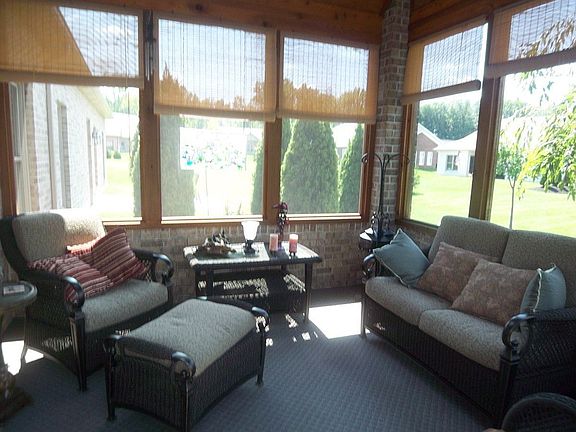 Enticing luxury brick condo serenely sited on a lushly landscaped and meticulously manicured corner lot in The Bradfords, one of newest upscale communities. Showcasing a dramatic move-in-perfect design combining soaring cathedral ceilings and airy architectural appeal. A striking arch supported by robust concurrent columns escorts you from the sensationally spacious gourmet-ready kitchen boasting abundant staggered height cabinetry, entertainment-scaled center island, and adjoining dining rm to the expansive cathedraled living rm anchored by cozy window-adorned fireplace. Stroll anytime through French doors to the skylit-crowned glass-encircled sunroom to invite the outdoors in or step outside to the sprawling private patio tucked behind trees for complete serenity. Beauty meets function in the spa-inspired owner bath featuring dual sinks of extended height and extra width shower in soothing neutrals for daily pampering. Intimate covered entry porch, handsome hardwoods, beautiful!