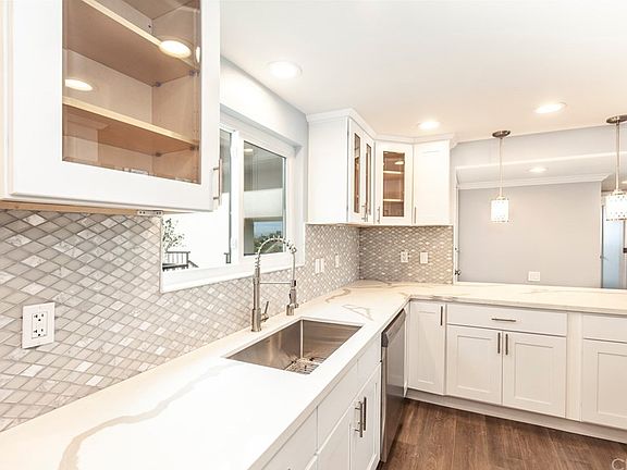 Top to bottom upgraded!! Welcome home to this beautiful 3 bedroom, 2 bathroom penthouse suite located in the highly south after Laguna Woods Community. This private corner home has NO STAIRS, elevator from parking spot, and tons of natural light. Everything in this home has been stylishly redone and is ready for move in. Kitchen has beautiful soft-close white shaker cabinets including: roll out drawers, quartz countertops, oversized island for cooking and entertaining, marble backsplash, stainless steel appliances, large pantry, and breakfast nook. Spacious living room opens directly onto large glass-enclosed private balcony via 2 new sliding doors. Master suite features spa-like bathroom with frameless shower, his and hers closets, and elegant vanity with dual sinks. Additional upgrades include dual pane energy-efficient windows, crown molding, baseboards, door casings, electrical outlets and light switches, LED recessed lighting throughout, crystal chandelier, Kohler toilets, frosted interior doors, rain shower heads, mirrored closet doors, durable wood-inspired laminate flooring, and much more. Laguna Woods is a world class 55+ golfing community with 8 clubhouses, 5 pools, state of the art gym, horse stables, walking trails, and 2 golf courses. Be sure to check this one out, it will go quick!