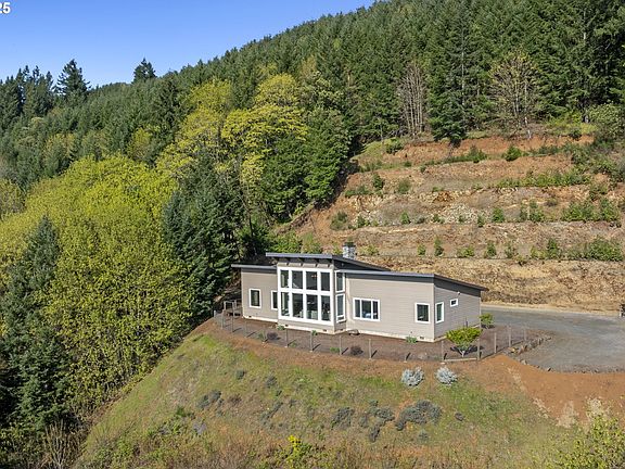 "The Summit at Corral Creek" house is tucked into the hillside of Parrett Mountain, this private, single-level custom home offers a modern retreat on 10.76 acres of peace, beauty, and thoughtful design. Surrounded by nature and wildlife yet just minutes from Newberg, Sherwood, and Wilsonville, it strikes the perfect balance between seclusion and convenience. Inside, the 2-story great room stuns with vaulted wood-beamed ceilings, a striking stone fireplace, and floor-to-ceiling windows that showcase sweeping panoramic views of the Chehalem Valley and Coast Range. Nearly every window in the home captures a scenic backdrop, creating a constant connection to the surrounding landscape. Wide plank hardwood floors flow throughout the open layout, adding warmth and character. The sleek gourmet kitchen is both stylish and functional, featuring stunning quartz countertops, high-end stainless steel appliances, and a massive island ideal for entertaining. The primary suite is a private sanctuary with French doors, dual walk-in closets with built-in organizers, and a spa-worthy bathroom complete with soaking tub, walk-in shower, double sink vanity, and expansive windows offering tranquil views with total privacy. Two additional bedrooms provide flexible space for guests or home office needs, while the laundry room offers additional storage and a sink for convenience. The oversized two-car garage features modern glass doors and is wired for a welder or EV charging. Outside, a paved parking pad offers extra space for vehicles or equipment, a fenced area is perfect for pets, and a covered wood storage area keeps firewood dry and close at hand. Peaceful, private, and thoughtfully designed, this is the mountain-modern lifestyle you've been waiting for.