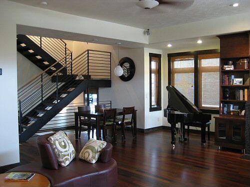 Sophisticated modern finishes complete this low-maintenance urban townhome in desirable Bown Crossing. Rich ipe wood (Brazillian walnut) floors expand through the great room, large windows & glass patio doors invite natural light, and open stair rail with modern horizontal railings add function & style. Wood wrapped & casement windows capture the fabulous foothill views. A gourmet kitchen features custom cabinetry, travertine slab counter tops & a 36 commercial style range.