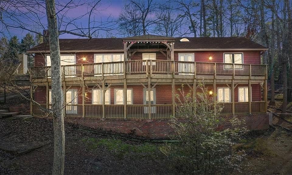Absolutely stunning Lake Lanier views from nearly every room! This rustic/craftsman ranch home boasts a master on the main level and another on the lower level, complete with a second full kitchen perfect for separate living quarters or in-law suite. Recently painted exterior, ample parking with a two-car garage, carport for 1 car on the main level, and parking pad for 2 cars on lower level. Oversized rooms throughout. LVP floors, new carpet, and a fully renovated kitchen with under cabinet lighting on the main floor featuring quartz counters and stainless-steel appliances. This home has beamed ceilings and two fireplaces that add comfort and warmth. Other updates include new HVAC system, new gutter guards, and two oversized covered decks showcasing the breathtaking Lake Lanier scenery. A workshop/storage shed with HVAC and electricity adds convenience. This home is meticulously cared for and offers plenty of storage. Don't miss the chance to call this your dream home!