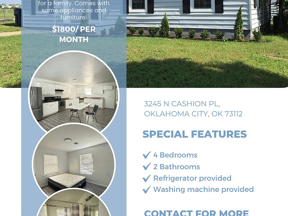This spacious single-family home at 3245 Cashion Place in Oklahoma City offers an open floor plan with four bedrooms and two bathrooms. The property has been completely remodeled, featuring newly painted walls and refurnished counters. The modern kitchen includes in-house washer and dryer hookups for added convenience. A covered back patio provides a comfortable outdoor space for relaxation or entertaining. Additionally, the home boasts a very large garage, offering ample parking and storage options. Situated on a large corner lot across the street from an elementary school and park, this location is ideal for families seeking both space and accessibility.