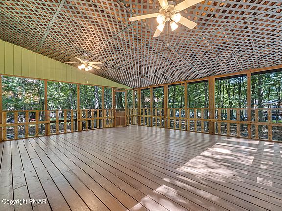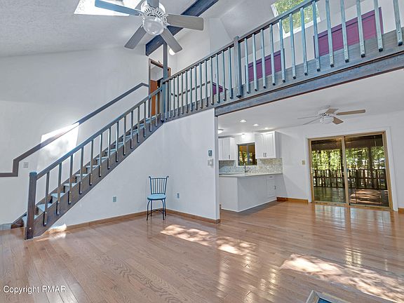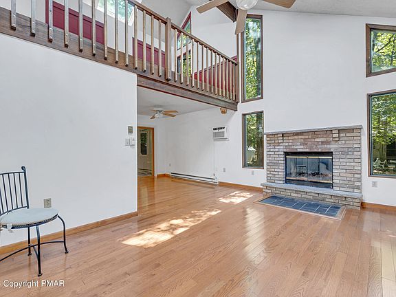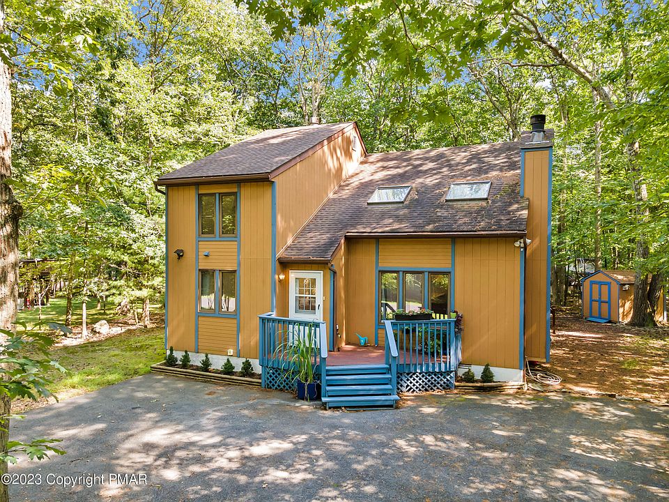 Adorable home is ready to welcome you! Whether you seek a weekend getaway place, an entry level rental property, or your very own home sweet home, you'll find much to love here. Extras like gleaming wood floors throughout, quartz & stainless steel in the kitchen, and the biggest screened porch you could dream of ensure great value for your $$. The primary bedroom is privately situated on the 2nd floor w/a thoughtfully planned & unique bathroom suite complete with a 2-sided fireplace. The adjoining sunlit loft is a great flex space. Two more bedrooms & a bath on the main floor. Seasonal enjoyment is ensured w/a cozy brick fireplace in the living room & you will love the skylights & large windows to bring the outside in. Level property w/a paved driveway & a color coordinated utility shed. Entertain your friends or just relax w/a book listening to the birds in the 20X20 screened room out back, complete with two ceiling fans to ensure your comfort. There is also a small deck attached for your bbq grilling pleasure. Penn Estates community is highly sought after by primary home buyers and second home buyers alike because of it's excellent location central to major routes, shopping, medical, and all the Pocono attractions. Inside the community you have access to pools, lakes, a sports complex, fitness center, a dog park, and year-round activities for all age groups. There is even an on-site food establishment/convenience mart. Come fall in love with this great property, affordably priced & ready for you!!