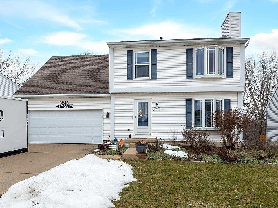 Awesome NW Davenport location with incredible wooded area views! This fantastic 2-story home features 3 bedrooms, PLUS a Large BONUS ROOM or possible 4th Bedroom with 2 full bathrooms all upstairs, including a private master bathroom that has been remodeled featuring a gorgeous tiled walk-in shower and dual vanity. The primary bedroom has 2 closets and a bay window with bench seat. The main floor living room features a wood burning fireplace and bay window with bench seat. Updated eat in kitchen has stainless appliances and direct access to the 2-car garage for bringing in groceries. The living room is open to the informal dining room that has sliding glass doors leading to the LARGE (25' x 14') composite deck featuring incredible views of the wooded area behind the home. There is also an updated half bath on the main floor. Unfinished walkout basement leads to your fully fenced backyard, a patio with brick pavers, firepit, and hot tub that stays with the home (being transferred in "as-is" condition and is not warranted). Per seller furnace and A/C new in 2019. Ducts professionally cleaned January 2024. Large 2-car attached garage with work bench area completes this beautiful home.
