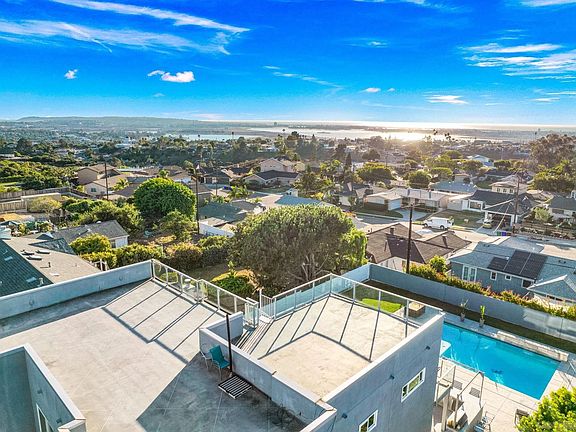Welcome to this rare, stunning modern home in Bay Park with the highest panoramic rooftop deck views of the ocean, Mission Bay, sunsets, fireworks, Point Loma, Pacific Beach, and beyond! This newer construction home was built in 2014 with permits, where high end materials were used throughout, offering the perfect blend of luxury and function. As you step inside, you are greeted with tall 10’ ceilings and an open concept with a beautiful flow.