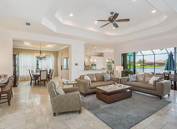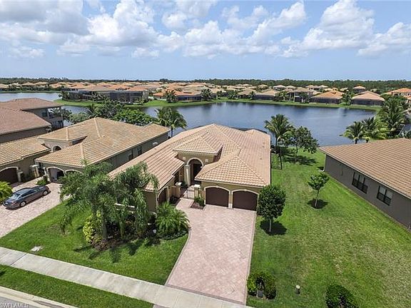 Sited on a premium lot with sunset and expansive lake views. This "Carlyle" floorplan offers lots of custom features for even the most disciminating buyers. Enter thru your private courtyard which features double custom iron scrolled doors. The view is breathtaking from the living space to the screened pool with spa and pond beyond. The sunlit eat in Chefs kitchen features upgraded neutral cabinets, stainless steel appliances, double ovens, extended pantries, plantation shutters, granite countertops and large center island. A formal Dining Room is easily accessible. New Creme/Beige Travertine floors flow thruout the home. A spacious gathering Room has custom builtins and a full walk in Bar for entertaining. In the Master you have his and hers custom walk in closets, custom bath vanities, jetted tub, walk in shower and beautiful wood floors. A en suite guest bedroom and two additional bedrooms and full bath. Dont miss the Club Room retreat with great builtins and plantation shutters. The screened lanai has a heated pool, spa and water feature. Three car garage, great for a golf cart too. Don't miss this!!!
