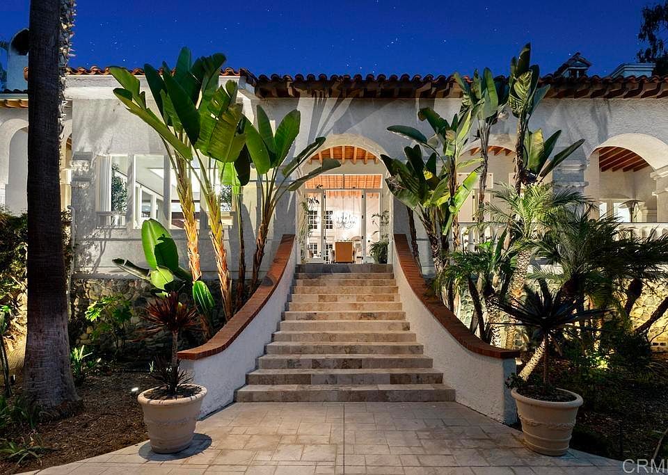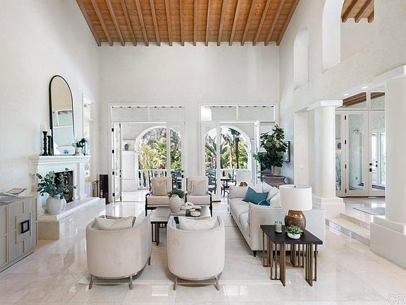 Tucked away on a private hilltop, this 5-bedroom retreat offers breathtaking mountain and valley VIEWS along a lush, tree-lined drive. Situated in the only gated community within the prestigious Rancho Santa Fe Covenant and the highly sought-after Roger Rowe school district, this rare gem is also part of the gated South Pointe Farms community. The home boasts soaring ceilings, large picture windows, and French doors, filling the space with natural light and a refreshing ambiance. The main-floor primary suite features a modern bathroom with a steam shower, soaking tub, wood-burning fireplace, two walk-in closets, and a cozy lounge or office nook overlooking the beautiful grounds. Upstairs, you'll find three additional bedrooms, two full baths, and a media room with an adjoining hobby or wrapping room. The gourmet kitchen opens to a bright breakfast area and a family room that leads to a tranquil outdoor patio and an underground wine cellar just a few steps away. Spanning 2.99 manicured acres, the property includes expansive lawns, a lap pool, space for a pickleball or sports court, and a detached 1-bedroom, 1-bath guest house with a kitchenette. As an added bonus, the home also boasts owned solar! Located near Encinitas, you're just minutes from shops, restaurants, and the beach, with Moonlight Beach less than six miles away!
