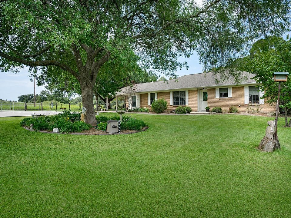 Don't miss out on the beautiful property. Enjoy the peacefulness and the nature from your front porch or back patio. Sits on two acres with so much to offer and still room for more options. Hog wire fenced around the 2 acres, added additional slab for parking with a double gate. The pump house has been recently painted that holds the well and softener. Your own she shed (Morgan Building) that has power and AC, irrigation system surrounds the property, beautiful oak tree. A barn/shop (25x30) sits on the back of the property for your cars, tools and toys. Dry creek bed in back of the property. Has never flooded! One mile from Navidad River. Don't miss out on this one, it won't last long!