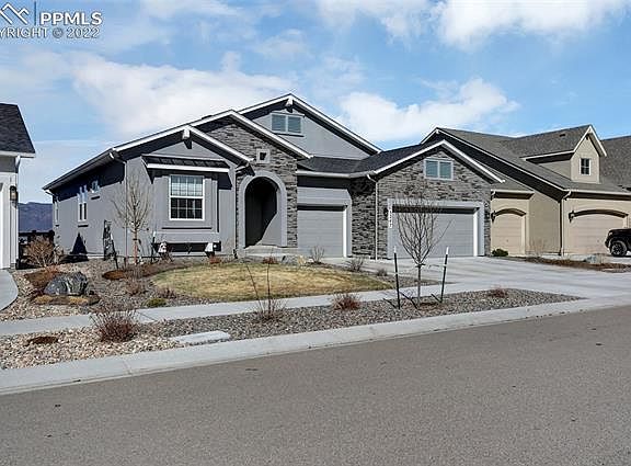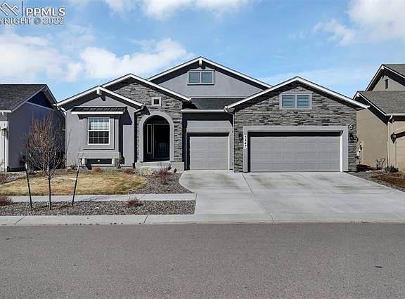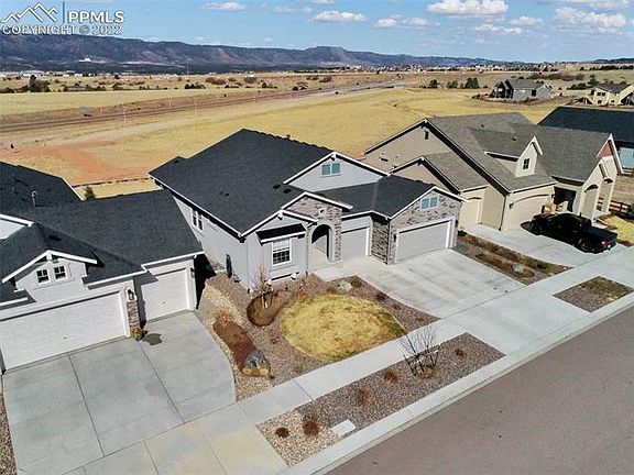 VIEWS! VIEWS VIEWS! Hello Colorado home buyers! Have you ever driven by a home and said I would love to own that home, here is your chance. Come on in and look around, you will find yourself not wanting to leave. This home sits in the highly coveted North Fork subdivision and backs to open space. Amazing and almost new, highly upgraded stucco and stone home that boasts huge ceilings and amazing views of the city, Air Force Academy, mountain range, and of course the awe inspiring Pikes Peak. 5 big bedrooms, 3 highly upgraded bathrooms with quartz countertops, an extra room for an office or formal dining area, 3 car garage on a big lot in the D20 neighborhood. Big windows bring in tons of natural light. Huge custom gourmet kitchen with quartz countertops, gigantic island with room for seating, double oven/microwave, walk in Pantry, and windows everywhere with flawless views. Custom gas fireplace with floor to ceiling tile, mantle, and built in blower in the main floor living room that will be perfect for entertaining on those chilly and snowy Colorado nights. Custom wall to wall upgraded 8 foot tall sliding glass door walks out to a big covered Trex deck stacked with breathtaking views. Main level master bedroom with attached custom bathroom with huge spa shower, custom tile in shower and on the floor, huge walk in closet with custom shelves, custom cabinets and nice big dressing area. Another big bedroom, full bath and a laundry room with sink and folding table can also be found on main level. Basement has a Jr Master sweet with a huge walk in closet. Basement also has a 9 foot ceiling height with a walk out to a covered concrete deck. Huge entertainment area and wet bar. OVERsized heated garage with lots of storage. Central vacuum system, custom water softner system, wireless sprinkler system, blackout shades, fresh landscaping with drip lines. Miles of walking, biking and running trails. I could go on and on, but how about I just say, Welcome Home!!