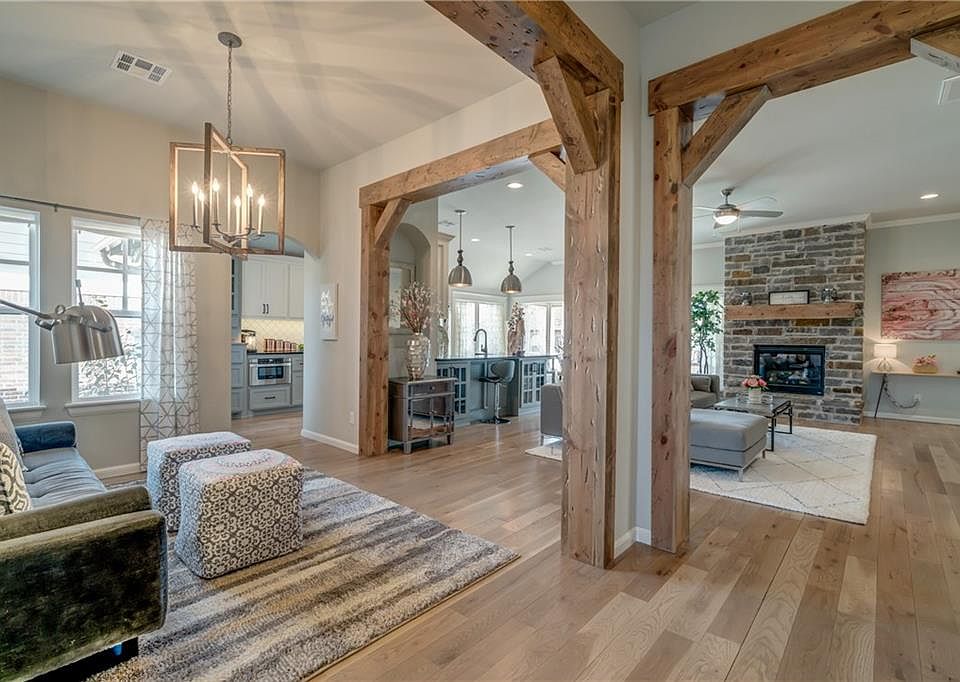 THIS REAL-LIFE DREAM HOME is a truly charming OASIS. Timber framed pathways lead into a spacious built-in STUDY, a SHIP LAP dining room, and OPEN LAYOUT living with natural brick gas fireplace. The picture perfect kitchen features STAINLESS appliances, farmhouse sink, GRANITE counters, a crisp, white backsplash and soft dove gray/white cabinetry. Beautiful WOOD floors complete the urban farmhouse feel, ALL ON ONE FLOOR. The BONUS room between 2 more bedrooms, offers the perfect playroom for the kids or extra sitting room for guests. Town Square is a historically-inspired community featuring a wooded GREENBELT, POND with fishing deck, & walking TRAIL. The Residents Club, now under construction, will feature a CLUBHOUSE, FITNESS CENTER, resort POOL, playground, community garden, AND MORE! Easy ACCESS TO I-35, the Turnpike, shopping, new hotel & Convention facilities makes this a great location in a great Edmond community!