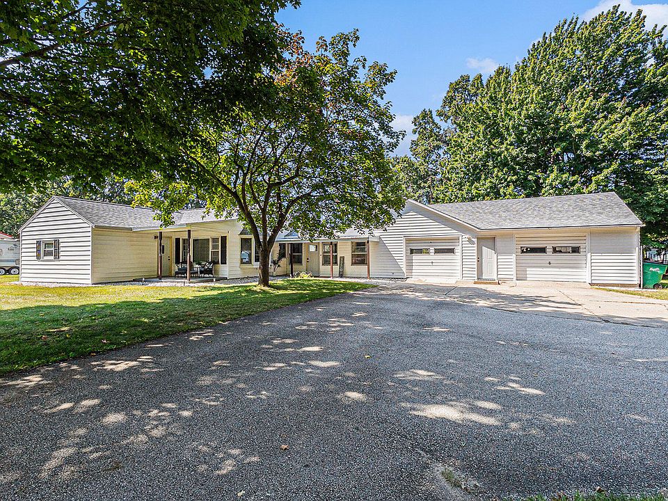 Fruitport ranch on a quiet cul-de-sac! This 1,300 sqft home sits on a wonderful half acre lot. The home offers main floor living, with 3 bedrooms, 1 full bathroom and a spacious kitchen with tons of counter space. The living room has two large windows, letting in plenty of natural light. The oversized 2 stall garage, and large shed are both great for outdoor storage and parking. You will love spending summer nights in the spacious yard and on the patio or in the gazebo. Updates within the last 3 years include new roof (2022), new furnace w/ AC (2022), new water heater (2023), new floors, some new windows, and new tub/toilet. Convenient location close to many stores and restaurants. Seller is a licensed Realtor. Buyer to verify all information.