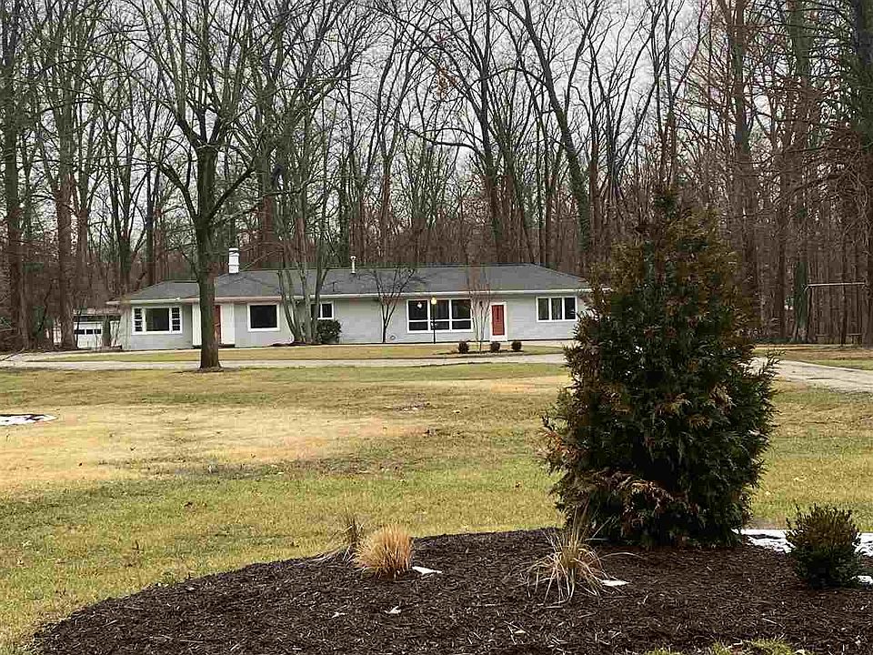 What a perfect setting for this ranch home nestled back on the 2.27 acre lot with a wooded backdrop, screened porch & outdoor fire pit ready for you to enjoy. Walk into this completely updated home offering formal open living & dining rooms with restored hardwood floors & a wood burning fireplace. Updated kitchen featuring new appliances, new counters & open to a casual dining area & family room w/built-in bookshelves, all with brand new oak flooring you're going to love. Split bedroom floor plan with primary bedroom offering wonderful views, two closets adjacent to a modern bath. Bedrooms 2 & 3 located on south side of home flanking a beautifully updated full bath. The basement is partially finished housing an open laundry space, a finished office space, large space for home exercise as well as a daylight room for growing plants all year long! Detached one car garage + new landscaping complete this home. Home has new wiring, electrical box, plumbing & new septic for worry free living.