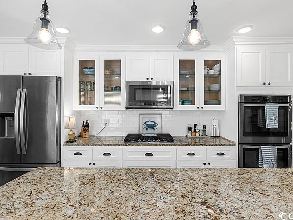 Introducing a property beyond superlatives! Behold this SPECTACULAR 5BR-3BA raised beach home in Cherry Grove, perfectly positioned on a deep channel. It's the ultimate fusion of beach and channel living, offering an unparalleled lifestyle. Enjoy the luxury of not one, but two private docks - a stationary and a floating one, complete with flip-over stairs leading into the channel. Take in sweeping vistas from the Widow's Walk, where panoramic ocean and Cherry Grove views unfold before you. Impeccably maintained and ready for you to call home, this residence beckons you with its second and third floor living areas. An open floor concept creates a sense of spaciousness and elegance, customized to perfection. The chef's kitchen is a masterpiece, boasting sleek granite countertops, custom cabinets, a double oven, a drop-in gas cooktop, and an exquisite backsplash. A sizable work island/breakfast bar with a sink and an expansive walk-in pantry cater to your every culinary need. In the living room, a gas fireplace sets the tone for cozy winter evenings. Ascend to the third floor, where you'll be greeted by a stunning oak staircase and a captivating round custom window. Five unique bedrooms and three full baths await, each characterized by custom vanities, tile showers, skylights, angled ceilings, and ceiling fans. Underneath the house unveils an outdoor haven - an enchanting gathering space for cherished moments. Multiple sitting areas beckon, whether it's on the dock, the country swing, the bar, or by the fireplace. The outdoor bar/kitchen is a dream, complete with a sink, barbecue grill space, and a small refrigerator. The fireplace boasts a wood surround, stone base, and mounted TV, creating a captivating ambiance. Two outdoor showers, including one enclosed with a dressing room, add to the convenience. This property is ideally situated just minutes away from an array of shops and an eclectic selection of restaurants in NMB. Enjoy the vibrant entertainment of Ocean Drive's Main Street and relish in the excitement of the Intracoastal Waterway. Your slice of paradise awaits - schedule a showing today and seize the opportunity to own this remarkable coastal treasure! All measurements are approximate, but not guaranteed. Ask your agent for the complete list of upgrades for this property! HVAC replaced 2022. Roofs replaced original 2016 & addition 2022. Rinnai Water Heater installed 2022. House painted in 2022.