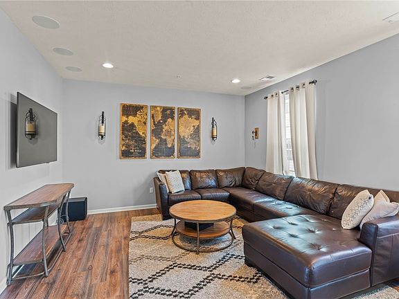 Fantastic three bedroom, two and a half bathroom end unit townhome with loads of updates and sits on of the largest, level lots on the street. Upgrades include a four foot extended floor plan, gourmet kitchen with granite countertops, extended island, double door pantry, stainless steel appliances, and large dining area. The entire main level features an open concept floorplan with 9 ft ceilings, a huge living room with loads of windows, natural lighting, built in surround sound speakers with included receiver. The upper level offers a large owners suite that comfortably accommodates a king size bed and has trayed ceilings, a walk in closet, and bathroom complete with a granite countertop double bowl sink, walk in shower, & tub. The rest of the upper level has two additional bedrooms, laundry area, & full bathroom off the hallway. The lower level has a finished game room with a sliding glass door which leads to the rear yard. HOA fee covers grass cutting, mulching, & shrub trimming.