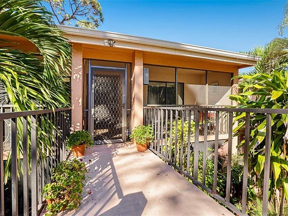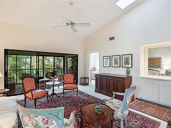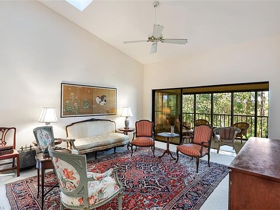 FEEL LIKE YOU ARE LIVING IN A TREETOP HOME! This rarely available Sandy Pines condo overlooks a mesmerizing lake where you can watch the Osprey diving for fish as you enjoy your evening cocktail. Beautifully decorated and furnished 2 bedroom / 2 bath unit with private entrance through a screened in lanai overlooking a lovely patio garden. Kitchen and morning room open to the screened front lanai with preferred southern exposure providing a great space for that morning coffee. The vaulted ceilings have 2 sky lights that bring tons of light and a feeling of spaciousness. The 1 car detached garage with extra storage located only steps from your front door. Beautiful tropical plantings all around. Bay Forest is less than a 10 minute drive to both Delnor-Wiggins State Park/Beach and Barefoot Beach and only 1 mile from the Cocohatchee River Marina and boat launch.