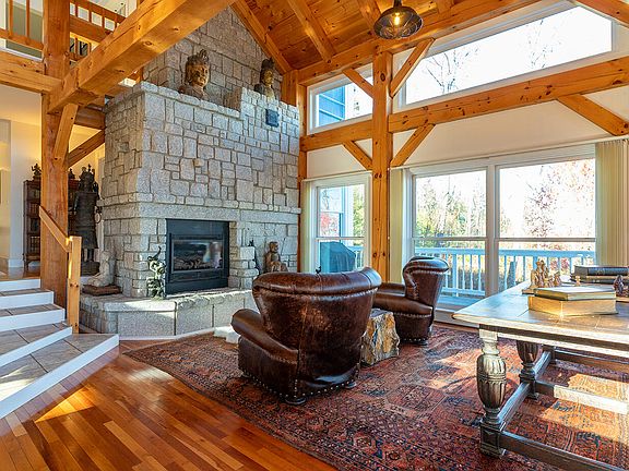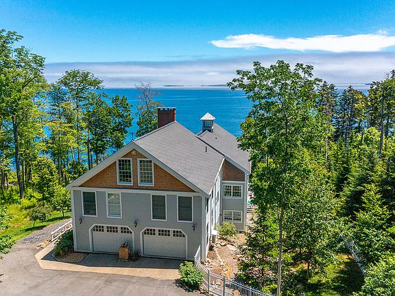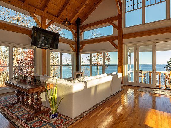 Fantastic Post and Beam home situated on a private 3.5 acre beautifully landscaped oceanfront site just 2 miles from downtown Camden and its picturesque harbor. If privacy is what you crave, this is the house for you. Brand new electric gates with video call box open to a newly paved 1/4 mile driveway that winds through the forest to this gorgeous 5 bed 4.5 bath home. The magnificent open great room has 25+ foot ceilings and floor-to-ceiling windows designed to take full advantage of the spectacular ocean views. This room also features a large stone fireplace, propane ''wood'' stove, dining and living areas. Watch gorgeous sun and moon rises over the ocean from the newly remodeled kitchen that has all new stainless-steel appliances and quartz countertops. Primary bedroom has tall ceilings and large marble bathroom with dual-head steam shower and heated floors. Two additional bedrooms on this level share a huge bathroom and a clawfoot tub with ocean views. Two oversized lower level bedrooms each have kitchenettes, large bathrooms, and share a deck with ocean views. Each has either in-house or private entrance for possible income potential. There is also a second laundry room on this level. A three-season stream runs through the property, fenced back yard for dogs, and two gravel paths lead down to the private beach with deck. Huge basement and expansive attic offer plentiful storage. Whole-house propane generator and extensive security system provide peace of mind. The oversized attached two-car garage has a Tesla charger that works with other cars as well. Home has radiant heating throughout, Split system Air Conditioning with heat pumps creates a very comfortable environment in all seasons. All bathrooms have luxurious heated floors. The property backs up to beautiful Camden Hills State Park with all its hiking trails. So secluded, all you will hear while sitting on your deck is the ocean and birdsong.