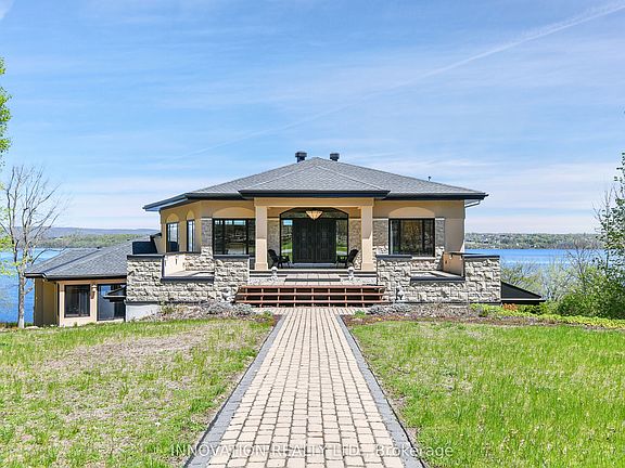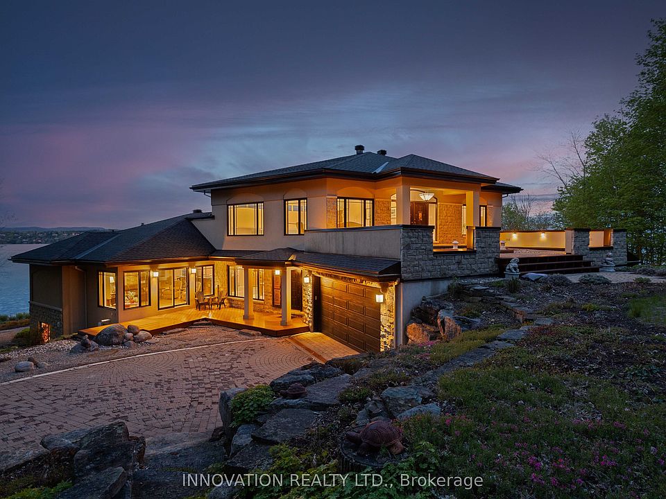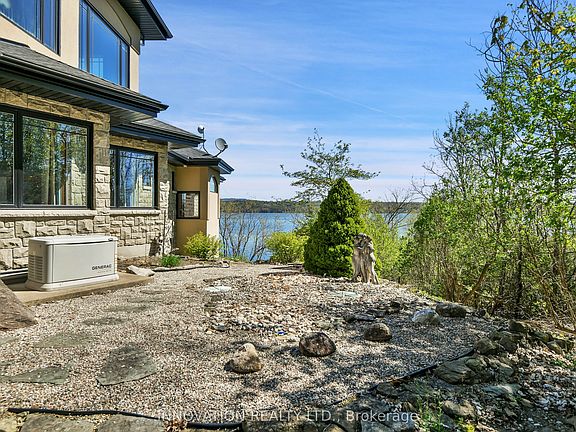 EXCEPTIONAL RIVERFRONT PROPERTY Perched safely above the Ottawa River this substantial highly customized home is designed to capture breathtaking views with private river access. Very private 1.59 acre property with 200ft riverfront. 180 degree views up & down river with fabulous city skyline vistas to the east. 4960 sqft of living space above grade plus over 2000 sqft finished space in the walkout lower level. Unassuming entry loft level opens to large open concept space as you descend the stairs giving an indication to the scale of this home. Artisan built natural stonewalls respect the rocky terrain. Customized at every corner & curve each space takes advantage of walls of windows to feature views of river & Gatineau Hills and the customized gardens all around the property. Great Rm has lofty ceilings w/skylights, fireplace, and circular staircase to the Recreation Room below. Kitchen is central to Dining & Family Rm. This well equipped Kitchen is perfect for entertaining. Very large Dining Room is accented by natural stone walls and arches. Family Room next to the Kitchen offers lovely garden views with afternoon sun & a fireplace. Spa space offers hot tub, sauna, rain shower + bathroom. Primary Bedroom suite has it all: corner windows w/views of the city skyline, deck, sunken Library, 5pc Ensuite & spacious Walk-in. 2 main level secondary Bedrooms each have Walk-ins, 3 piece Ensuites & loft spaces accessed by spiral stairs. Finished walkout lower level provides for a 2nd Family Room with a bar, Recreation Room, Media Room, 2 additional Bedrooms, a 3 piece Bathroom, and another Office. There is also a workshop, two utility rooms, and several storage areas. Extensive landscaping w/rock gardens, Trex decks, stairs to rocky shore & dock. Rare offering. 4 bay drive through garage. Generac generator for automatic transfer to the whole home if Hydro goes out. Located in Rural Kanata North along millionaires row, just minutes to many amenities.