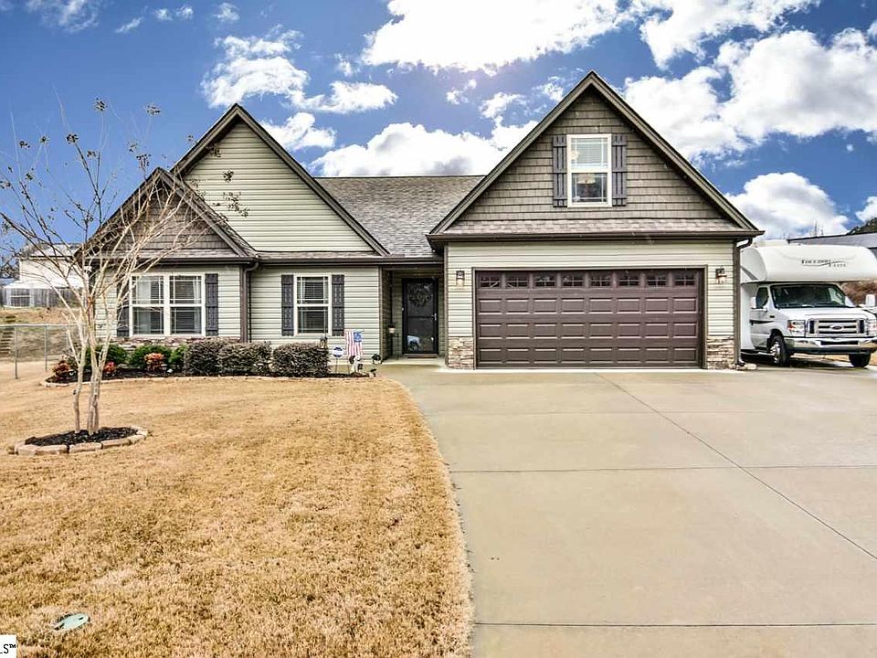 HOME SWEET HAPPY HOME!! Welcome to your new 3BR/2BA craftsman style ranch home (approx. 2134sf) in the growing and popular Fountain Inn, SC! Located on a long cul-de-sac lot just minutes from I385 and shopping on Main Street in Fountain Inn, this sweet home is barely lived in and boasts a wonderful open floorplan WITH bonus room and three-season porch! From the curb, you will quickly notice the long and expanded driveway which will easily allow parking for your RV with exterior electric hookup on the side (HOA allowed!) With a privacy fence surrounding the backyard filled with landscaping, notice how quiet it is here both inside and out! The large foyer area leads to open living with a vaulted ceiling over the great room and kitchen area. The center stone fireplace is set with gas logs fueled by a propane tank. This kitchen will quickly become the focal point of your home as well with all kinds of upgrades here.... lovely granite, under counter lighting, a super sized eat-at island, SS Whirlpool appliances including a dishwasher, built-in microwave, and amazing smooth top range with double ovens PLUS double-sized pantry! The dining room space boasts multiple windows adding to all the natural lighting. Low maintenance, lovely laminate flooring spans this whole living space. The seller loves the added three-season room to drink coffee each morning. The master on main is plenty large with a private bath featuring individual vanities and a beautiful walk-in tile shower plus a large walk-in closet! The two secondary bedrooms are spacious as well and serviced by the convenient hall bath. The walk-in laundry off the kitchen area also provides extra storage. Completing the main level is the two-car garage! Do NOT forget the bonus room complete with its own wet bar area! This one-owner home is just immaculate! You will appreciate how move-in ready it really is! Additional features include a satellite dish, full yard sprinkler system WITH separate meter, extra power for a potential hot tub in back, a built-in radon system, blinds, AND a transferrable termite bond! Living is SO easy here! The neighbors are all so nice too! Do NOT delay! Hurry home to 325 Catterick Way today!