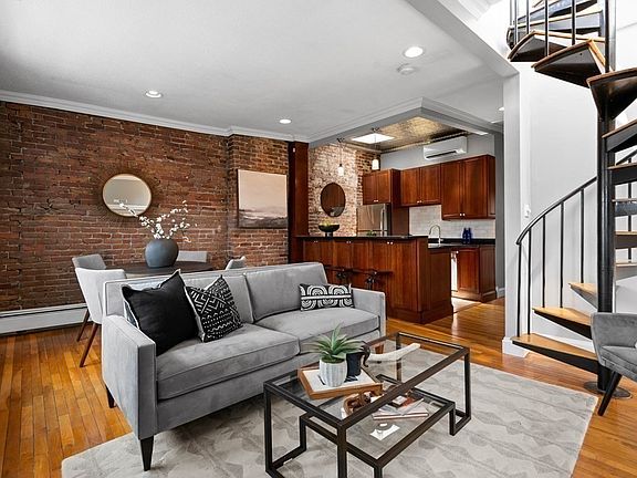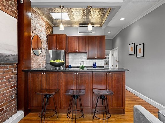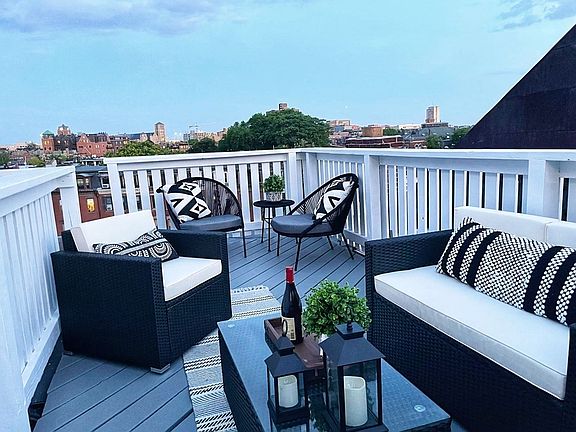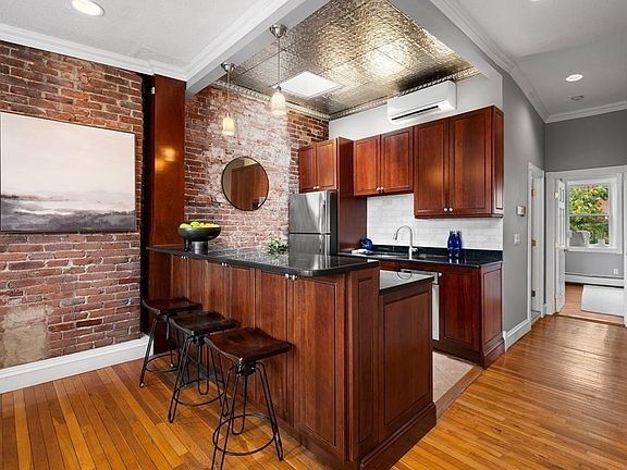 Penthouse unit overlooking desirable South End location by the Back Bay train stop! This updated open concept condo is filled with charming character and modern conveniences such as a two zone mini split air conditioning system. Upon entry, you will be greeted with original exposed brick and high ceilings with a tin accent and skylight in the spacious kitchen, which includes granite countertops, a breakfast bar and stainless steel appliances. Open to the kitchen is the sizeable dining area able to fit a full sized table, as well as the living area containing a wood-burning fireplace, built in shelving and direct access to the private roof deck with incredible unobstructed city views. Down the hall is full bathroom and generous bedroom tucked away in the back of the unit, with a large walk-in closet which also houses the in-unit washer/dryer. All of this while being in a pet friendly association that also has communal storage and available rental parking!