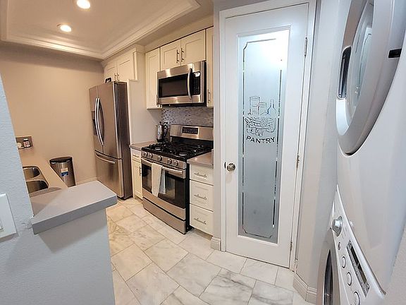 Spacious single level, downstairs one bedroom condo in gated community with pool and hot tub. Large master bedroom with walk in closet and bathroom with jetted tub and separate walk-in shower. Air conditioning, full size washer and dryer in unit, updated kitchen with walk-in pantry, oversized living room with fireplace, marble floors throughout. Sliding doors from bed room and living room open to large covered patio. Covered assigned parking space with storage closet and guest parking.