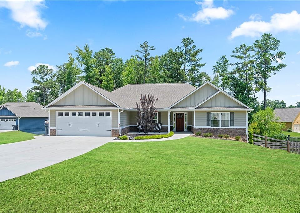 Where Can You Find A House Like This, For A Price Like This, In A Community Like This? Right Here! This Super Cute And Very Well Maintained House Is Located In Harlan Trace Subdivision. No HOA. A Cul-Du-Sac, In A Relaxed Community. Craftsman - Style Ranch offers 3 bedrooms and 2 bathrooms, spacious open floorplan, a separate dining room, a family room with stacked stone fireplace and a Chef's kitchen with stainless steel appliances, granite counter tops with a large island. Primary Suite includes double vanity, 6ft tile shower and his and hers walk in closet. The secondary bedrooms on the other side provide flexibility for children and guest. The perks don't stop inside a very spacious covered deck overlooking big, beautiful back yard. With above ground saltwater pool and deck, firepit and TV already installed on wall. Great Environment for Entertaining Family and Friends.