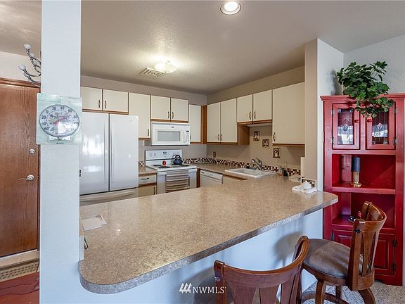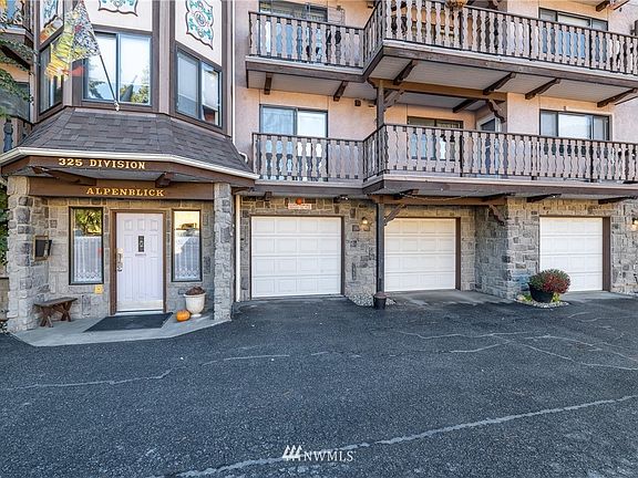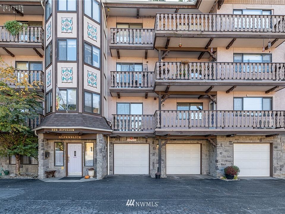Turn-key condo w/1 car garage in the heart of downtown Leavenworth and close to the Wenatchee River! One of only 3 units w/master bedroom turret making this one of the larger units available in Alpenblick. Enjoy peekaboo views from the balcony and updates throughout kitchen & baths, walk-in closets, pull out pantry, in-unit laundry. Building features secure access, elevator, guest suite available to reserve, locked storage & community rec. room w/full kitchen, big tv, sauna & pool table.