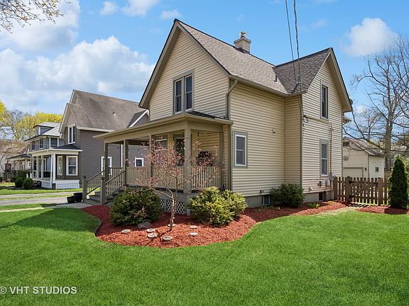 You'll fall in love with this vintage 4 bedroom Victorian from the moment you see the covered front & back porches, living room Bay window, sparkling main floor full bath and bedroom, beautiful kitchen, custom moldings, white panel interior doors/crown molding/trim throughout, and a large fenced yard! Paired with modern updates and amenities, starting with the gorgeous sun-drenched modern kitchen w/stainless appliances, soft-close cabinet doors, granite countertops, tons of 42" cabinets, and ample counter-space. Elegant hardwood floors & beautiful original trim work on most of first floor, along with other quaint features. The living room with bay window overlooks your front yard & porch! There is a centrally located dining area as well, off the kitchen and living room. As you make your way up the beautiful staircase, you will be amazed how open the second floor feels. Spacious loft/landing and 3 additional large bedrooms for all! Newer LVT flooring throughout the 2nd floor! The full bathroom is the most adorable you will ever see! Large basement features a laundry area, and other space for a work out room, workshop, hobbies, storage, etc., PLUS large crawl space for even more storage. As you step out the back door into the large fenced yard you can make your way to the oversized garage. DON'T MISS THE STAIRS IN THE GARAGE THAT WALK-UP TO A BONUS 16'X16' STORAGE AREA. Roof, siding, insulation and plumbing were all listed as newer when purchased 4 years ago. Newer basement insulation! Newer hot water heater! Some vinyl replacement windows throughout. Excellent location close to shopping, restaurants, library, high school, Rte. 14, METRA train, and all the downtown businesses.