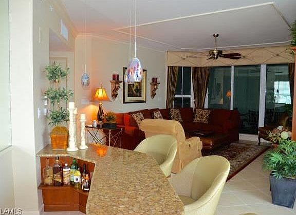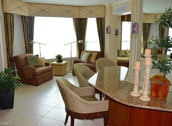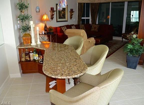 Breathtaking Gulf and Bay Views from this Penthouse that shows like a model. Tastefully renovated, offering a warm decor, and open, expansive views, makes this property a comfortable place to enjoy your winter season in Naples! The Each room offers a beautiful view. The spacious Living Room has comfortable seating, Entertainment Center with a Large, Flat-Screen TV., and the sliders open onto the screen-in lanai. The Kitchen has customized cabinetry, quality appliances, and is well-stocked. The Dining Area has a built-in couch and chairs. Enjoy entertaining at the Bar, offering a granite counter, and 3 comfotable bar seats. The Master Suite has a King-Size Bed, Flat-Screen TV., private sitting area, walk-in closet, large bath with double sinks, Tub., and walk-in Shower. Enjoy views and direct access to the lanai from the master suite. The Guest Bedroom has a Queen-Size Bed, TV, spacious closet, and a private bath. The 2nd Guest Bedroom offers Twin Beds, TV., and a 3rd bath off the hall with a combination Tub/Shower. There is tile throughout, and a beautiful, wrap-a-round Lanai with electric shutters
