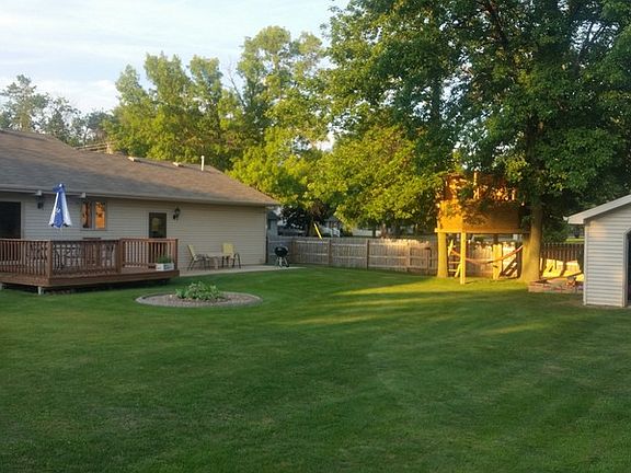 This home has a large fenced yard, tree house for the kids, and an extra large shed in backyard with electricity . Garage is finished with heater. House is close to schools and walking distance to park. Master bedroom has a walk in closet and full bathroom with tub. Basement has large finished rec. Room with new carpet. Basement is also stubbed and framed for future finishing. Kitchen and living room have valted ceilings along with large picture window in living room. Kitchen has ample storage and patio door to back yard and deck. House has bricked covered front porch. Yard features nicely landscaped yard with brand new curbing.