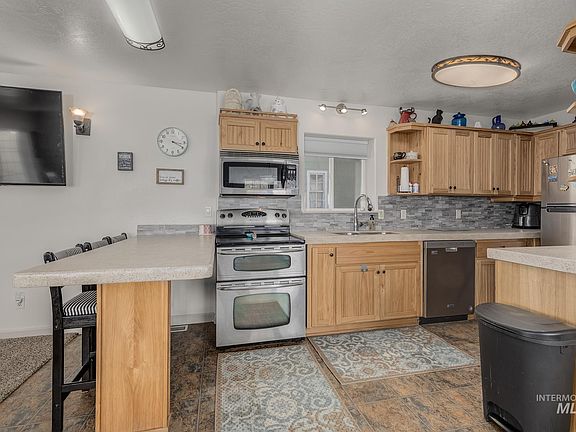This is the perfect peaceful getaway or to live here full-time! This spacious 2 bedroom, 1 bath home features an open concept living space, updated kitchen, vinyl windows, new interior paint, walk-in tile shower and so much more! Enjoy the views from the covered patio, updated trex decking, metal roof and a fully fenced yard. The 18x20 metal shop has power and alley access. Beautifully landscaped with full automatic sprinklers, raised garden beds, fruit trees, grapes, RV hook-up, large corner lot and a big paved parking area. All stainless steel appliances included. Just a few minutes to the river so don't miss out on this perfect property!