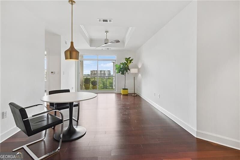 Embrace the ultimate in modern living at this inviting 1- bedroom condo in a fantastic building overlooking the bustling Buckhead Village district. The recently remodeled unit features over $25,000 in improvements: new continuous hardwood flooring throughout, beautiful built-in closet system, new architectural downlighting and track lighting, new paint throughout, and new faucets. The HVAC was fully replaced in late 2018, and the water heater was replaced in 2019 with an efficient tankless unit providing unlimited hot water for your spa-like shower experience. Abundant natural light, richly toned wood floors and cabinetry create a warm and sophisticated ambiance. Enjoy the morning sunrises from your East facing oversized recessed 8' x 9' balcony that becomes an extension of the living space. Thoughtful details abound: This unit has a modified floor plan from the other 04 stack units in the building, featuring a larger entry and dining area. Lighting has been curated throughout to highlight accent walls, creating a gallery-like living space perfect for anyone with artwork. The unit includes 1 deeded full-sized (not compact) parking space in the lower level of the secured garage, and also a highly desirable deeded storage unit on the 3rd floor. Residents enjoy a wealth of amenities at Paces 325 including tennis courts, newly renovated saltwater pool, new fitness center, and renovated lobby and clubroom with the feel of a fine hotel. The 24-hr doorman building also offers concierge services for added convenience. Located adjacent to the Buckhead Village Shopping District, Fetch Dog Park, and near Frankie Allen Park with its baseball fields and tennis facilities, this condo offers the perfect blend of urban excitement and recreational opportunities. Less than a mile away, Path 400 provides easy access to major shopping and restaurants, making this condo an ideal choice for those seeking a vibrant, connected lifestyle. This immaculately maintained unit is a must see at Paces 325.