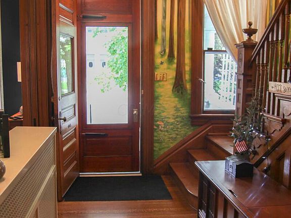 GORGEOUS POLISHED HARDWOOD FLOORS+Woodwork+Working Pocket & 6 Panel Solid Doors, Stained Glass Window+Ornate Entry Stairway+ BONUS 2nd Stairs. 4th BR/ 2nd Flr Lndry+New Washer+Dryer , PRIME Bedrm+Walk-in Closet, STORAGE. Newer Kitchen/Appls, Electric Heat+Htpump/ Air Condition+ Radiant Heat, New Hotwater Tank. Privacy Fenced Yard+Decking, 1 Car Carriage Garage. 3rd Flr Attic Potential Living Space. City Water+Sewer. Sparkling Fresh Well Maintained! Security Sys/Cameras, Easy to See!