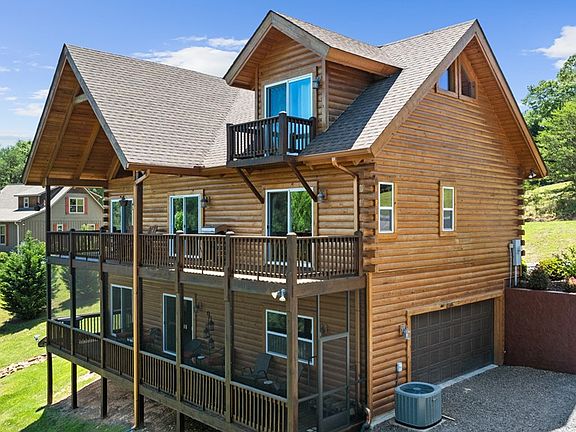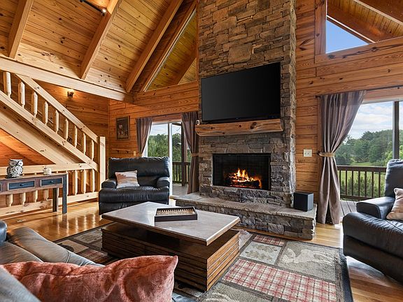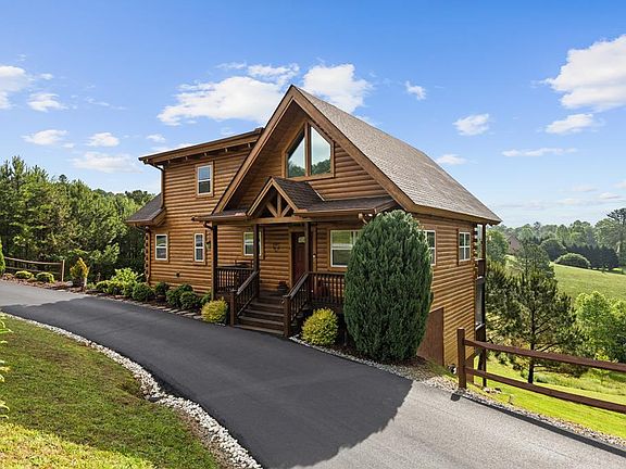 STR's allowed!!!! Escape to the tranquility of Emelia Estates, a haven for nature lovers offering breathtaking mountain vistas, pond views, and abundant wildlife right in your backyard. Nestled on a wooded cul-de-sac lot, this charming 2-bedroom, 3-bath cabin (with easy potential for a third bedroom!) provides the perfect balance of seclusion and convenience—just minutes from Blue Ridge, Blairsville, and SR 515. Step inside to an inviting open floor plan adorned with tongue-and-groove woodwork, hardwood floors, and a stunning stacked-stone gas fireplace that creates a warm and cozy ambiance. The kitchen features granite countertops and new stainless steel appliances (2023), while the bathrooms and laundry room showcase unique custom live-edge wood countertops. The fully finished basement is a versatile space, ready to transform into a third bedroom, a game room, or a home office. The spacious master suite boasts a walk-in closet, additional storage, a private balcony, and a beautifully tiled walk-in shower with a double vanity. A Juliet balcony provides a lovely office nook, while the main-level bedroom offers sliding doors to the deck, a double closet, and a full bath with a double vanity for added convenience. Outside, enjoy two back decks, a screened porch, a fire pit, and a circular paved driveway surrounded by elegant rock landscaping. With low HOA fees ($300/year), community water, and a drive-under garage featuring a workbench and storage, this home delivers the best of mountain living with timeless D-log cabin construction. Is this retreat the peaceful getaway you've been searching for? CAll ME!!!! Most Furnishings are negotiable on a separate Bill of Sale. Projected Rental Income $32,835 - $37,785 gross income - $199 - $229 ave. rate - 165 nights booked