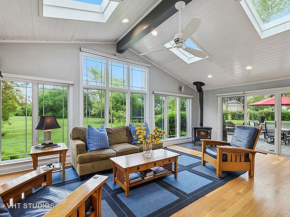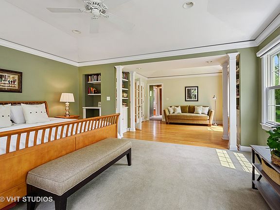 Fox Point brick & cedar colonial set on corner lot featuring charming front portico, covered stone porch, brick paver walkways & circle drive. This 4 bedroom, 2.1 bathroom home offers flowing floorplan, generous spaces, French doors, crown molding & hardwood floors. Kitchen is open to the family room with wood burning fireplace, custom entertainment center & built-in desk. Lovely dining room with coffered ceiling & shaker wainscoting, formal living room, first floor office & large mudroom. Luxurious master suite offers sitting area, huge custom walk-in closet & spa like master bathroom. Three additional bedrooms share the recently remodeled hallway bathroom. Finished basement with rec & game rooms, workroom & plenty of storage space. Beautiful heated sunroom with vaulted ceiling, skylights & wood burning stove overlooks the sprawling backyard & steps out to the stunning stone patio with firepit & lush landscaping. Enjoy summers in Fox Point's pool, lake, park & tennis courts. Walk to town, train, restaurants & A+ Barrington schools.