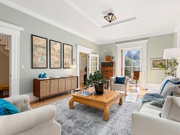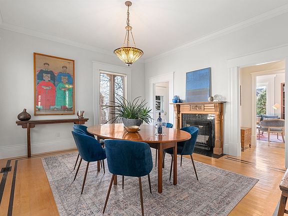 Winner of the Preservation Award, this striking property showcases stately entertaining areas, rare period details, soaring ceilings, and boundless space for work & play. Upon entering, there is an elegant foyer with a grand staircase. The 25' living room has inlaid floors & floor-to-ceiling windows. The formal dining room has a fireplace. A most refined library has inlaid floors, a capped fireplace & custom built-ins. The 20' eat-in kitchen offers a coffered ceiling, high-end appliances & caterer's pantry. The 30' 2nd floor hallway has an iconic turret with built-in bookcases. The lavish primary suite offers a walk-in closet & bathroom with a soaking tub. There are 3 more bedrooms plus a bathroom & laundry on this level. The top floor hosts the large 5th bedroom, custom office, and a curved staircase to the roof deck. The lower level houses a great playroom, kitchenette, bathroom, extensive storage & a bulkhead. Other amenities include stately porches, decks, patios & lawn irrigation.