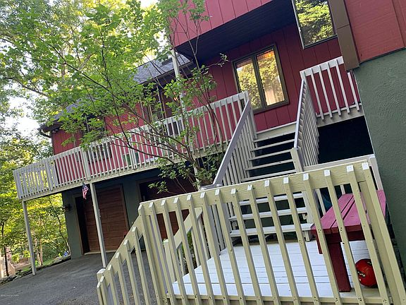 Stream Front Contemporary.....Listen to 'Saw Creek Water Falls' from This Large (3) Bedroom (3) Bath & Large Loft Contemporary with Full Basement and (2 car) Oversize Heated Garage. Lots of Windows, Hardwood Floors, Floor to Ceiling Stone-Faced Fireplace with Propane Insert...Beautiful Brand New Kitchen and Recreation Room Made for Steam Sauna or Jacuzzi/Hot-Tub. Hot Water Baseboard Heat and A/C