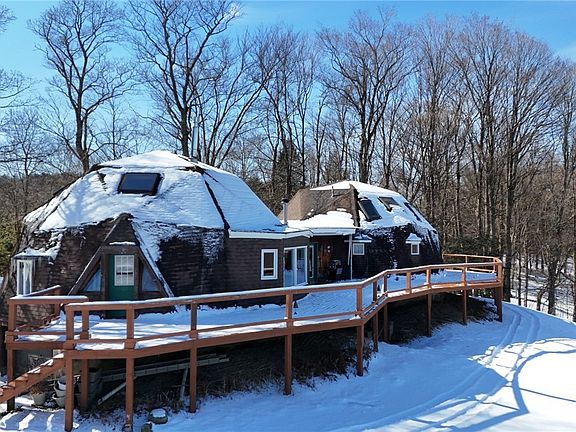 Welcome to your secluded sanctuary nestled on 115 acres of natural beauty. This unique double dome home offers a tranquil retreat with breathtaking views stretching for miles. With 4 bedrooms and 2 1/2 baths, this home provides ample space for comfortable living. Enjoy the convenience of solid surface countertops and large cabinetry in the kitchen, along with a cozy breakfast nook and formal dining room for entertaining guests. Step outside onto the expansive deck and soak in the serenity of your surroundings. The full walkout basement and garage under the house provide plenty of storage and parking space. Additionally, the property features a charming pole barn and a picturesque creek, adding to its charm and appeal. Don't miss this opportunity to own a piece of paradise in the heart of nature.