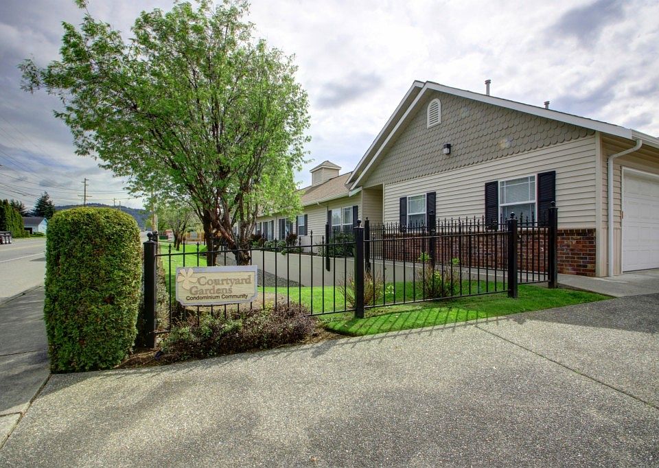 Courtyard Gardens Condominiums 55+ living. Convenient location to shopping and health care. This condo is immaculate! One level, no stairs. 2 bedroom plus office/den, 1.75 baths. Tall ceilings, gas frplc, gas cooking, dining area off kitchen, pantry, 1 car garage and an addtl parking space near front door. Spacious main bedroom has 3/4 bath and large closet. Gated courtyard w/ gardening areas plus community game room/clubhouse w/ kitchen and bathroom. This is a must see!