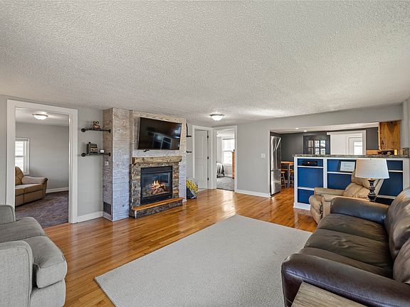 Updated 2-Bed, 1-Bath Move-In Ready! Updated bathroom with tiled shower, durable hardwood floors, paired with a gas fireplace with stone for cozy nights. Kitchen comes with newer appliances, ready for daily use. The standout feature is the huge 1,800 sq ft pull-through garage spray foam insulated, heated, and equipped with a bathroom, perfect for projects, storage, or hobbies. Outside, a large deck and patio offer plenty of space for relaxing or hosting, and the fenced yard adds privacy. Located just one block from the elementary school, this home is practical and well-positioned. A great find for anyone looking for comfort and functionality in a modern, updated package. All information obtained from seller and public records.