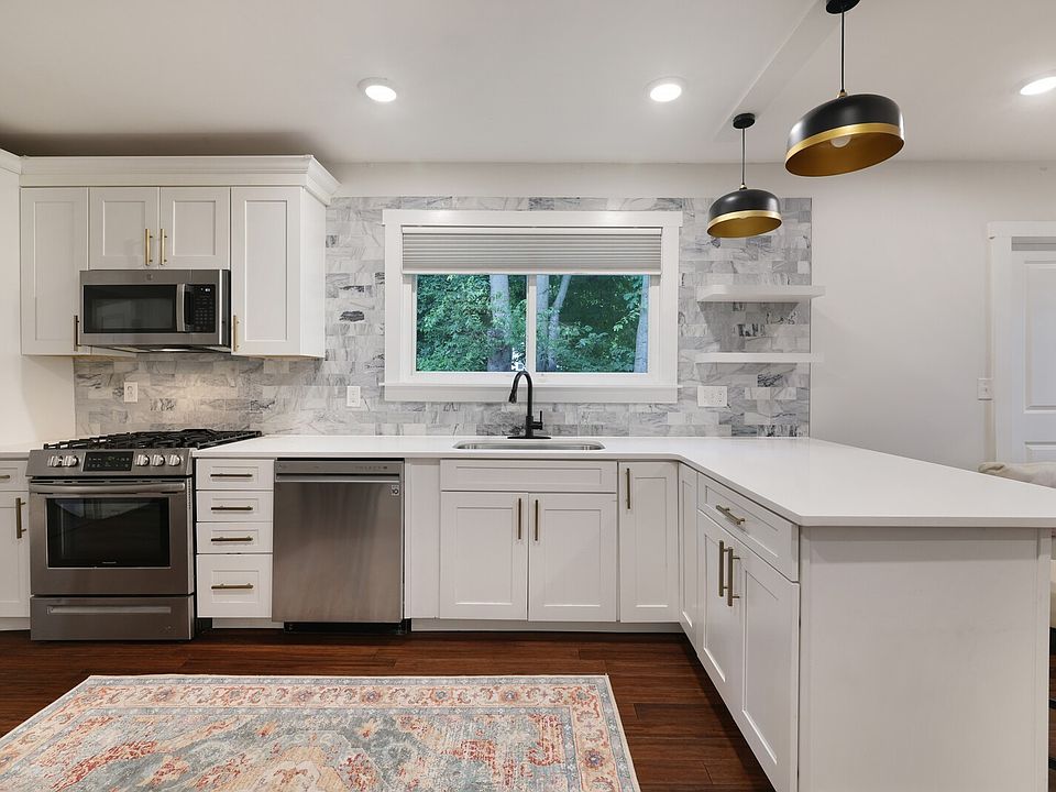 Modern vanitiesContemporary finishesDesigner touchesFilled with natural lightConvenient bartop with seatingChic gray backsplashStunning tile work