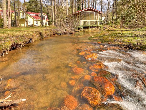 Cozy & spacious creekside cottage in beautiful park like setting.Almost 5 acres plus septic & electric for an RV on the adjacent lot.Other features include trout pond, creekfront screened in gazebo, quaint screened in porch, large great room plus another living area, new metal roof less than 2 yrs old, newer hardie plank siding, fully handicap accessible bathroom on main floor--all rooms on main level except the 3 upper level bedrooms, great central location between Blue Ridge & Ellijay & treehouse "fort" for the kids. No closets in the extra bedrooms (master does have closet),but plenty of room for armoires, etc.