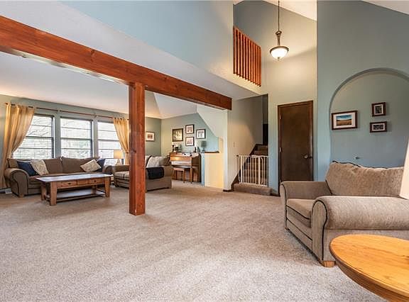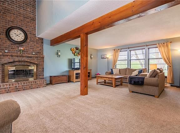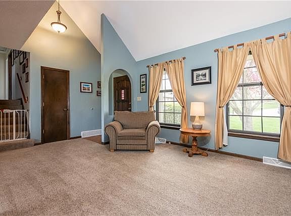 Tall ceilings and open living space as soon as you walk in! Check out this grand fireplace and wood beam! Kitchen offers eat-in dining and pantry. Half bath down here as well. Walk out to enclosed deck area, great for those rainy or buggy summer days. Great sized bedrooms...including large guest suite on top floor. Unfinished lower level walk out for more space or storage. New paint! HUGE fenced yard with no one behind. Central location in Olathe, close to K7, shops, schools and walking trails.