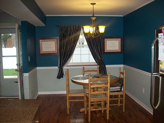 1st floor living room with bow window and crowned molding, Kitchen with breakfast bar, tile floor and oak cabinets, dining area with chair rail and powder room. Upper level has master bedroom with 2 closets and ceiling fan,2nd bedroom has ceiling fan also with laundry in closet, tiled hall bath with oak vanity Owner pays condo fee which includes water, sewer, lawn, snow