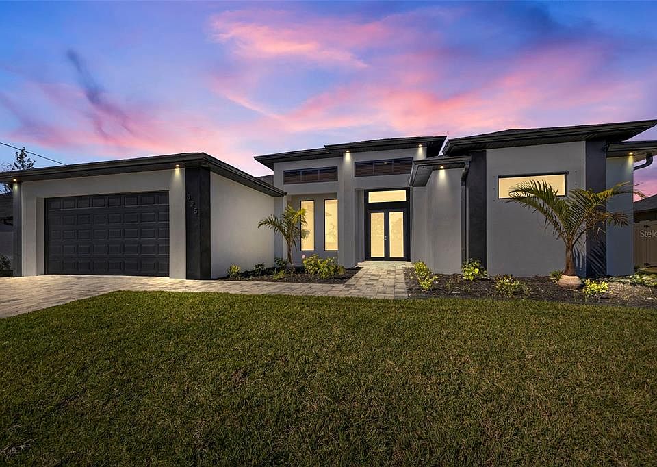 One or more photo(s) has been virtually staged. Mesmerizing NEW CONSTRUCTION home with great attention to detail, sure to impress! Grand entryway with tile pavers along the driveway and extending into the lanai area surrounding the entire enclosure. Tinted front doors lead into the large living area overlooking the large and modern waterfall island and kitchen area with stainless steel appliances. This home features 12ft coffer ceilings in the living area and 9.4ft ceilings in all of the other rooms in the home. Large floor tiles throughout the entire home, eight ft. doors, custom built-in tv enclosure with tile from floor to ceiling, along with an electric fireplace and a 65” TV. The master bedroom has a separate sliding door leading to the pool, two walk-in closets, dual sinks, an extra wide mirror, and a large freestanding tub with an elegant yet modern backsplash. Behind the tub is a spacious shower with a creative layout. An outdoor entertainment area with a full enclosure, a built-in grill station, a large pool with a water feature. Located on the 80ft wide Sandpiper canal, bring your fishing pole! A thing of beauty waiting for its first owner in paradise. *Not in a flood zone. This home is 98% completed.