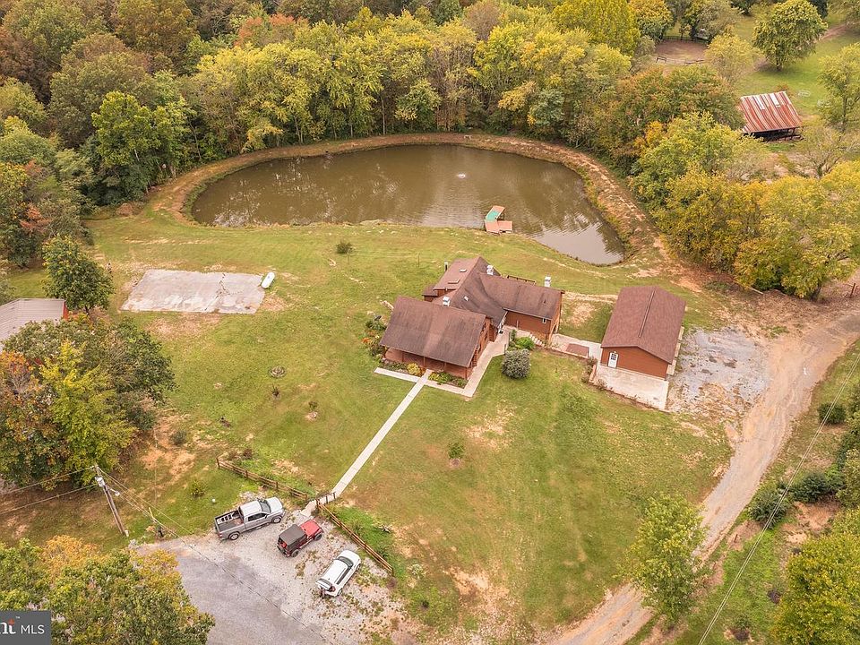 Log home on a quiet road with 4.27 acres, with a stocked pond with dock, trees, basketball court, apple trees, garden area, 3 stone fireplaces. Vaulted ceilings, 3 car detached garage and 1 car attached garage. Finished basement with bar. Just 10 mins. to Walmart, shopping center, 3 schools and I-81.