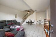 The 2-bed, 1-bath condo at 325 Standiford Ave, Modesto, CA 95350, is a ~1016 sq ft, two-story unit. It features an open living room, kitchen with appliances (electric range, dishwasher, fridge), and dining area downstairs. Upstairs has two bedrooms with good closet space and a shared full bathroom. Includes central HVAC, ...