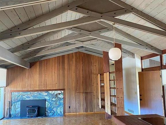 dignified and simply beautiful. The fireplace with insert, boasts a colorful tile surround that is in harmony with the natural setting. The home features a built-in vacuum, 2 gas furnaces, water softener, and a veranda that circles most of the home. Enjoy the beauty of nature from the expansive deck, ideal for morning meditation or evening relaxation. While offering tranquility, the property is conveniently located within a short drive to local amenities, schools, and shopping centers. This property is perfect for those seeking a peaceful retreat with access to modern conveniences. Property owner was told that Charles W. Moore was the architect; however, the city is unable to confirm this.